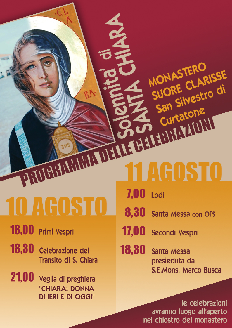 Il giorno 10 agosto prevede la preghiera dei Vespri alle 18, per poi proseguire con la celebrazione del transito della Santa e una veglia di preghiera alle 21 dal titolo: “Chiara: donna di ieri e di oggi”.