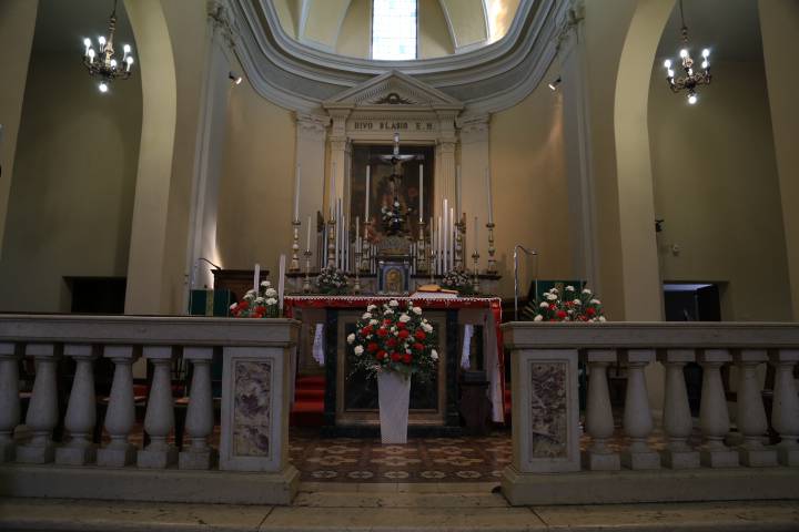 La parrocchia di San Biagio fu istituita verso il 1350 su una porzione di territorio già facente parte della parrocchia di Bagnolo San Vito. Essa comprende il centro frazionale di San Biagio e la borgata di Campione. La situazione occupazionale, florida, è caratterizzata da una presenza consistente di insediamenti agricoli altamente produttivi e di importanti aziende per la trasformazione dei prodotti stessi. Ad essi si aggiungono alcune piccole realtà industriali e una discreta presenza di attività artigianali; la popolazione locale che non trova impiego nella zona di residenza, tolti i professionisti, svolge l'attività impiegatizia o nel terziario. L'attuale chiesa parrocchiale, dedicata a San Biagio, fu costruita tra il 1764 ed il 1780 e aperta al culto 10 anni dopo. Venne a sostituire quella precedente, edificata nel '300. Notevoli restauri sono stati eseguiti in più occasioni, dal 1921 al 1989. A fianco della parrocchiale si trova un bel campanile alto 48 m e costruito tra il 1947 ed il 1950.All'interno della chiesa suggestiva è la pala raffigurante il santo patrono (1880) di Domenico Bonomi.