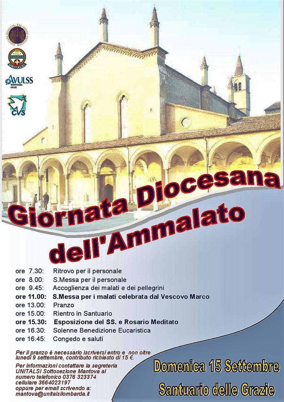 Operatori sanitari, associazioni di volontariato, persone malate e rispettive famiglie sono pronte a ritrovarsi domenica 15 settembre al Santuario della Beata Vergine delle Grazie (frazione di Curtatone) per celebrare insieme la Giornata diocesana dell’ammalato. L’iniziativa si rinnova anno dopo anno ed promossa da Unitalsi (Unione Nazionale Italiana Trasporto a Lourdes e Santuari Internazionali) in collaborazione con Avulss e Centro volontari della sofferenza. È l’occasione per sottolineare il valore della vita umana in ogni sua sfaccettatura, anche quando si trova in una condizione di fragilità e sofferenza.