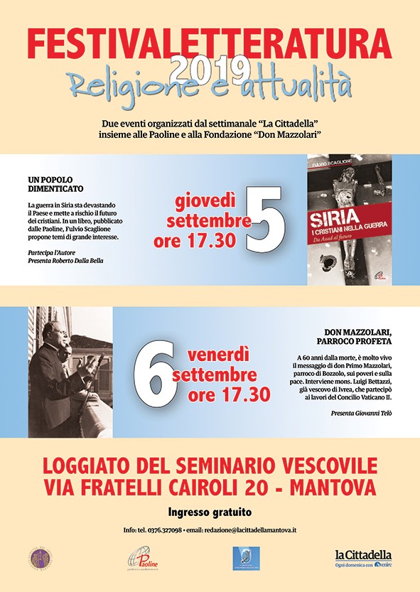 Primo di due appuntamenti organizzati dal settimanale diocesano La Cittadella insieme alle Paoline e Fondazione don Mazzolari, in occasione di Festivaletteratura, nel loggiato del Seminario vescovile di Mantova.